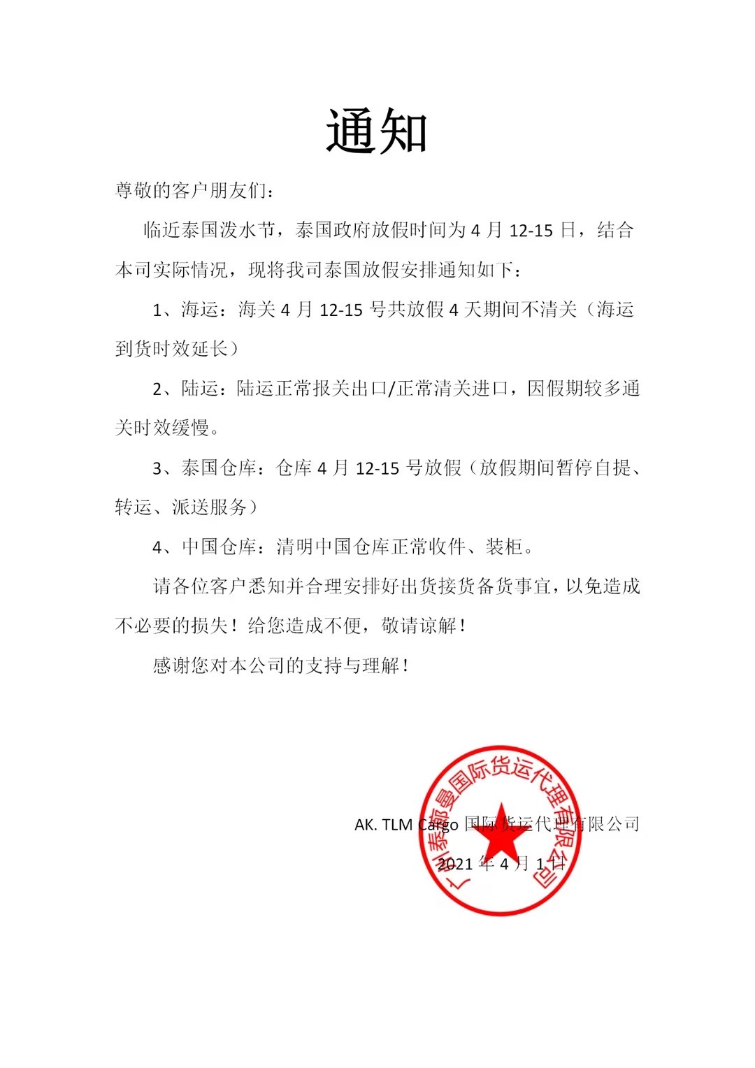 臨近泰國潑水節(jié),泰國政府放假時間為4月12-15日,結合本司實際情況,現(xiàn)將我司泰國放假安排通知如下: